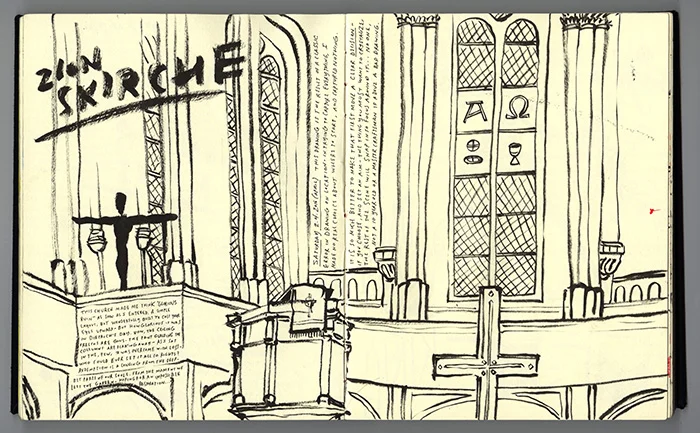 Sketchbook drawing at Zionskirche- Where Dietrich served as a pastor in Berlin. March 2016.